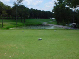 This is the shortest par 4 on the course with water on the right and a large tree on the left. The green slopes severely and your approach shot must lie close to have a chance for birdie. The green has a bunker both left and right.