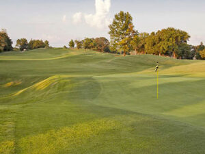 Great finishing hole at Holiday Hills. Uphill fairway with trees to the right. Fairway bunkers to the left. Severely sloped green with high mounds behind. This green has a tough putting surface.